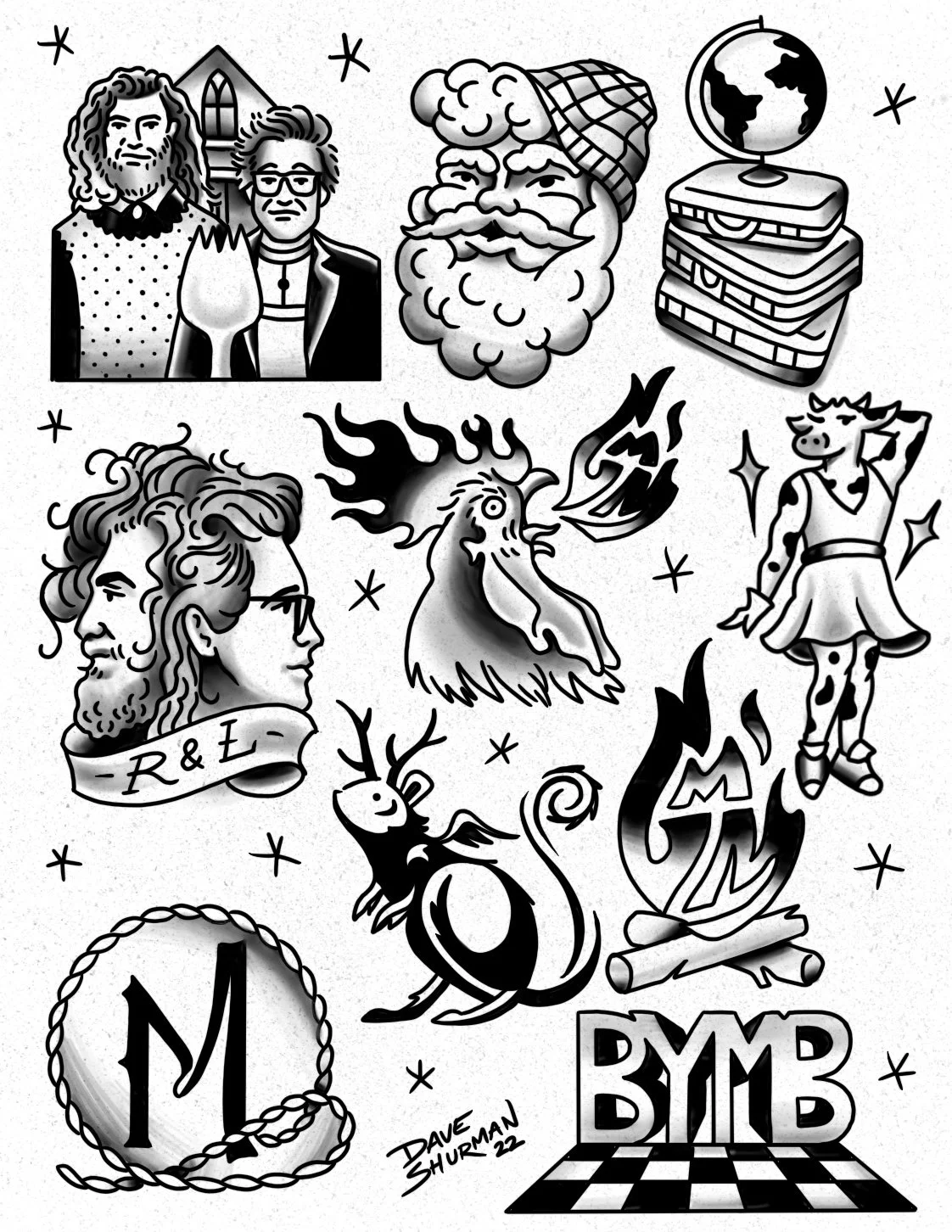 It’s simple. Once you contact us, we’ll schedule a brief, free consultation to discuss the details of your event, including the theme, guest list, space, price etc. From there, we’ll design custom tattoo flash tailored to your event’s vibe. This can be done in person or virtually.